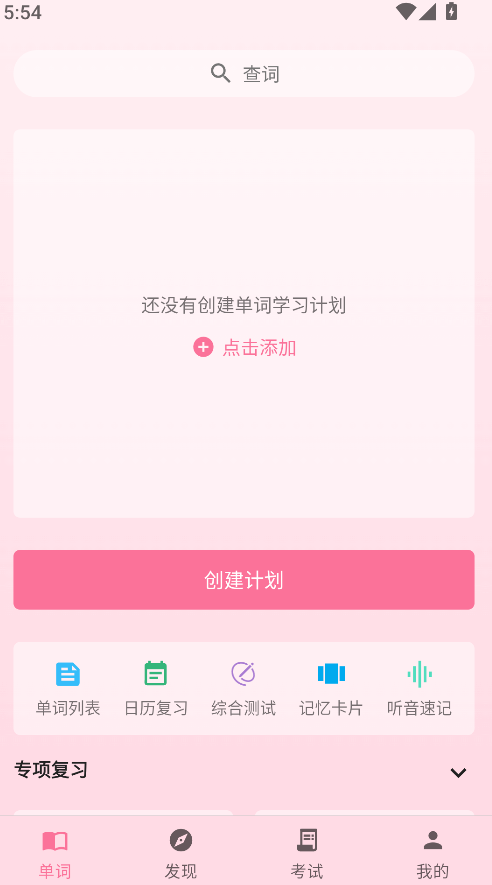 1、单词页,点“创建计划”定目标,列表学新词、日历复习旧词。