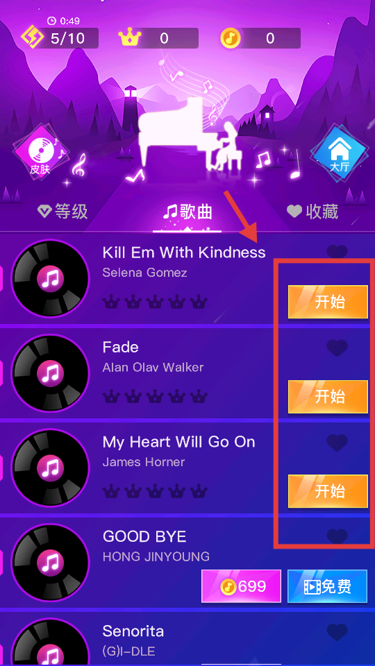 1、在歌曲列表中,选择喜欢的歌曲,点击右侧【开始】按钮进入游戏。