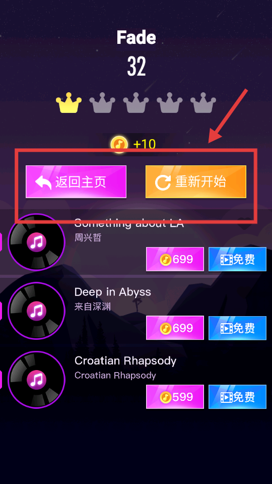 4、歌曲结束后,可选择【返回主页】或【重新开始】,继续挑战或更换歌曲。