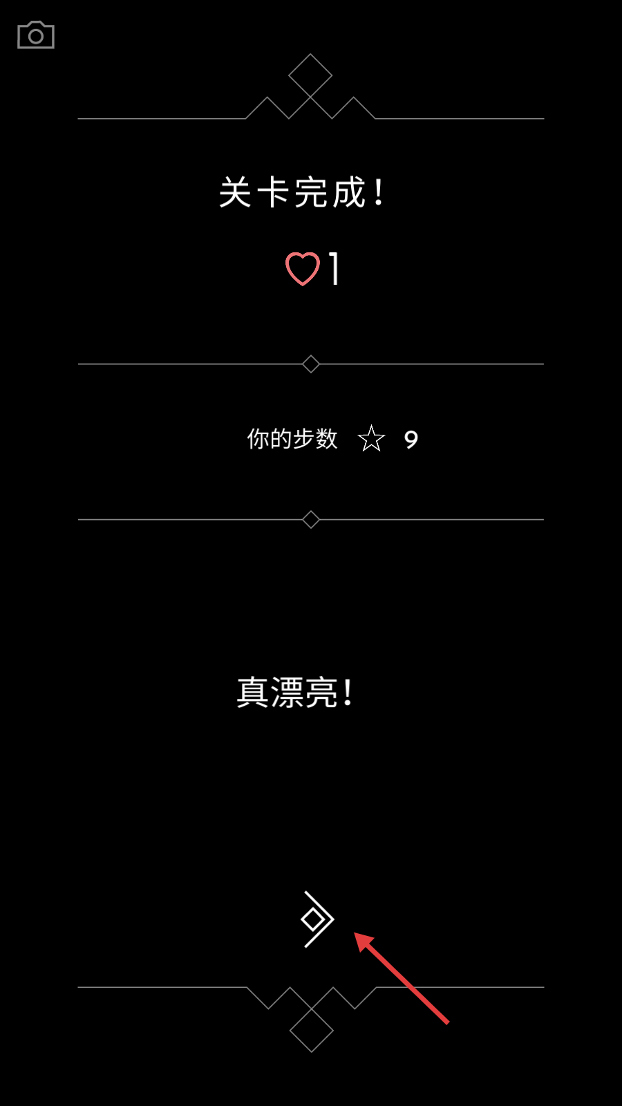 4、关卡结束,点击继续箭头,带着【步数9】的记录,奔赴下一场色彩几何的解谜挑战吧。