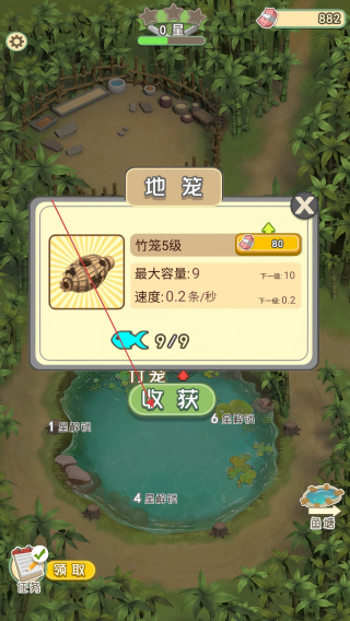 3、地笼装满鱼,点击【收获】,收取鱼类资源。