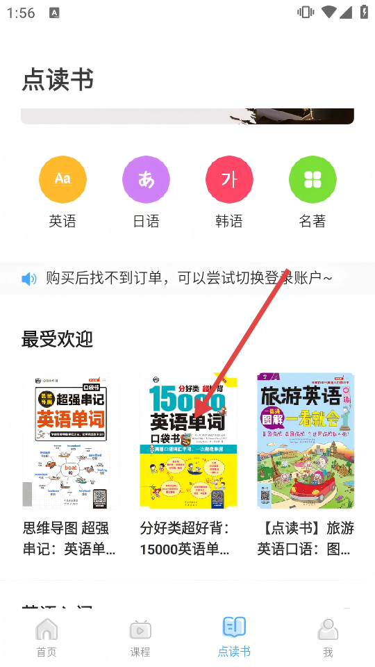 2、在【点读书】页面,选择【英语】等语种分类,下滑查看【最受欢迎】板块的单词书资源。