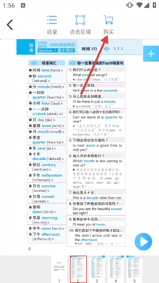 3、打开点读书籍后,点击顶部【购买】按钮,可付费解锁该书籍的完整学习内容。