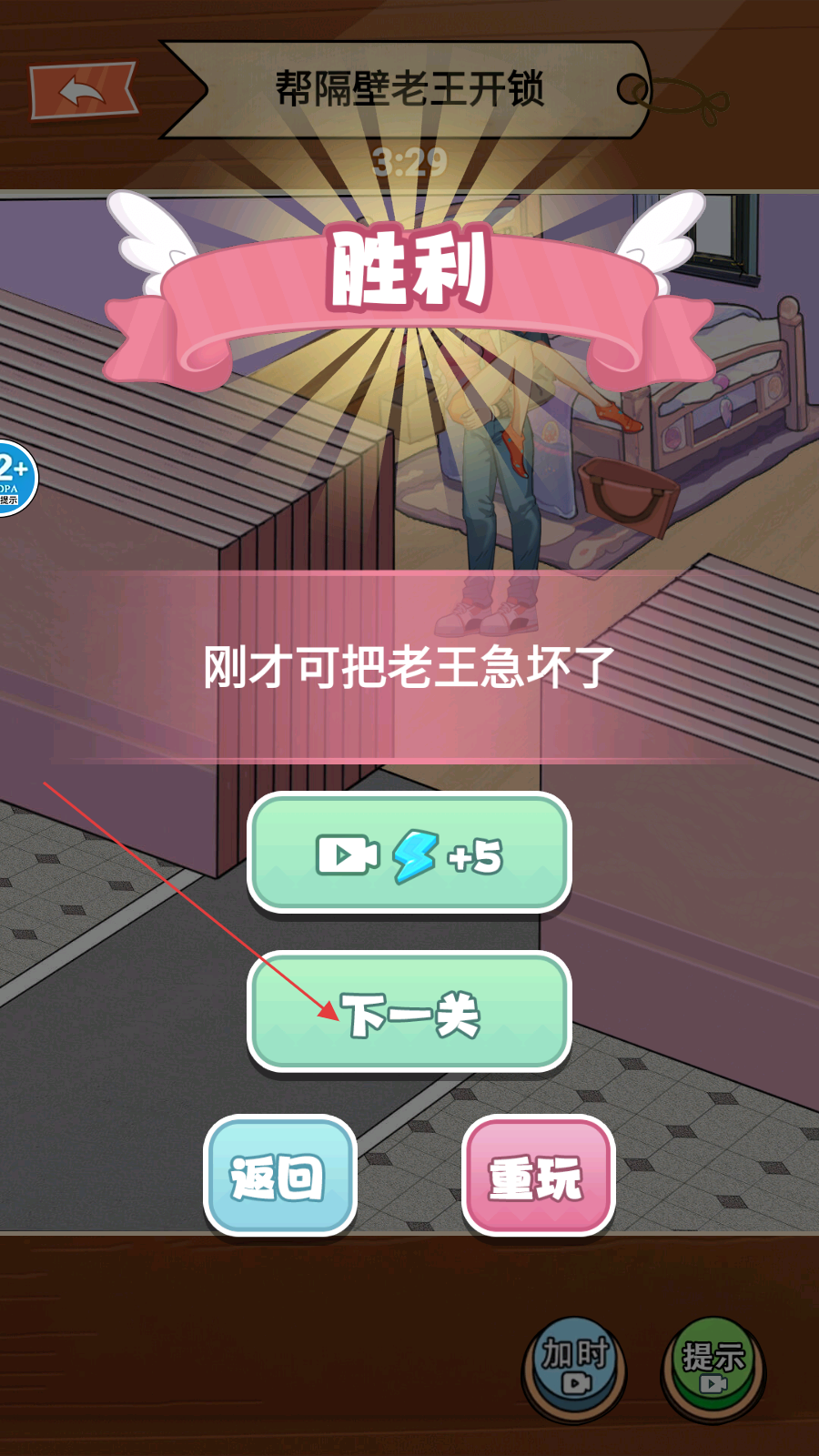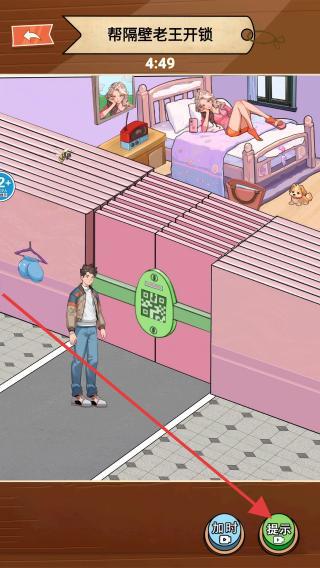 2、在帮隔壁老王开锁关卡,点击地上钥匙,尝试插入锁孔开锁。