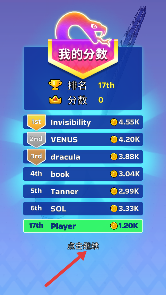 4、结算界面点【点击继续】,查看排名与分数,开启新一局对战。