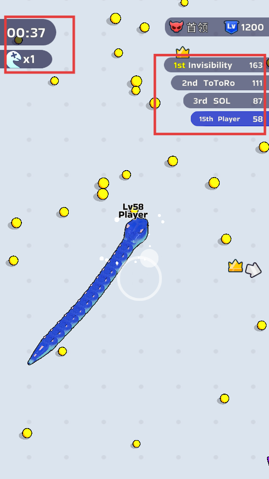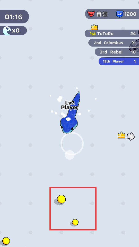 2、移动角色吃黄色小球升级,注意躲避首领与其他玩家。