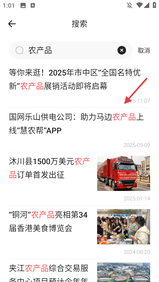 1、在乐山发布APP首页,点击顶部搜索框,输入关键词,进入搜索结果页面。