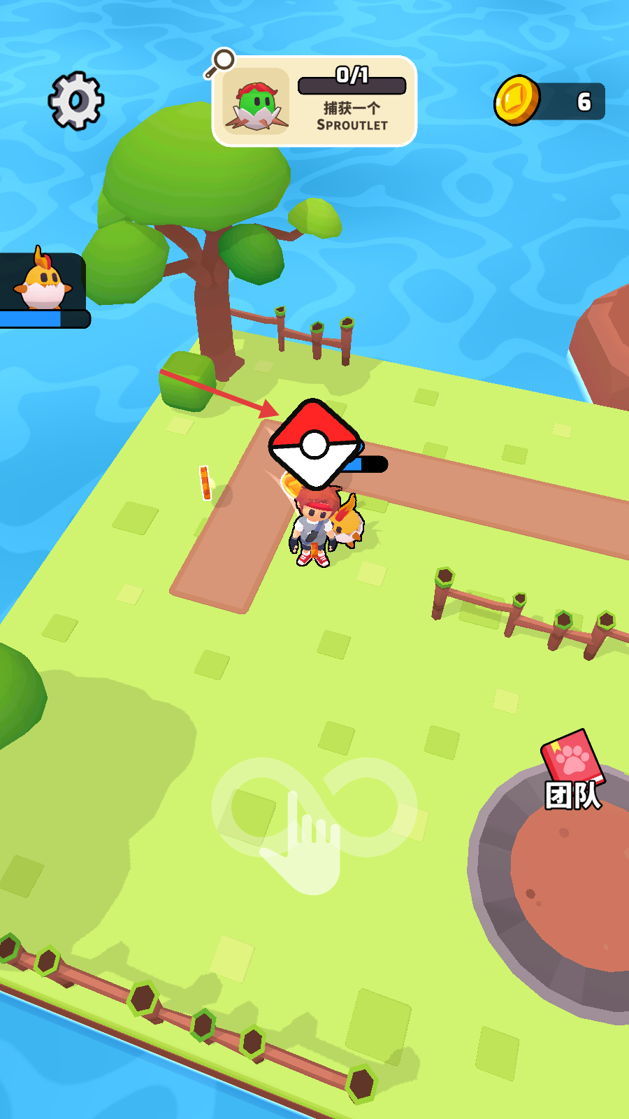 2、待角色接近怪物时,点击屏幕中的精灵球图标,尝试将【Sproutlet】捕获,推进任务进度。