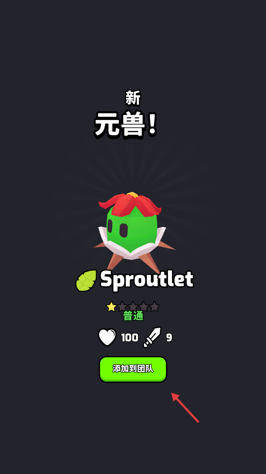 3、成功捕获【Sproutlet】后,点击绿色的【添加到团队】按钮,让新元兽加入小队,辅助后续冒险。