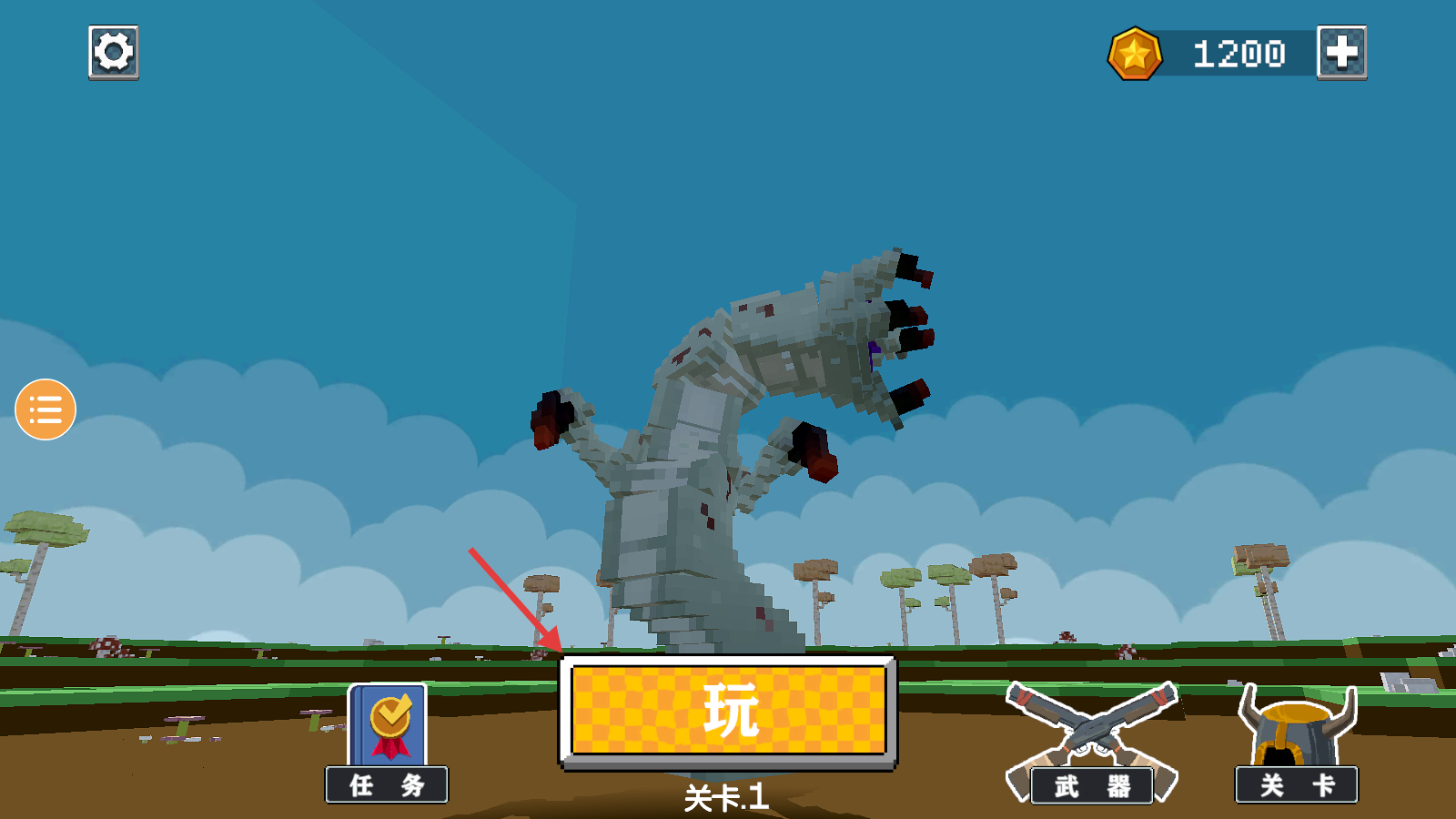 1、进入游戏主界面,我们点击中间【玩】按钮,开启【关卡1】,直面巨型怪物,开启冒险之旅吧。