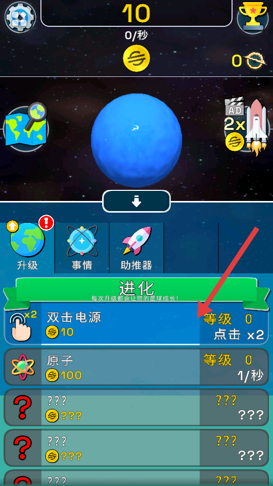 3、进入“进化”界面,消耗资源(如10金币)解锁“双击电源”等升级项,提升星球成长效率。