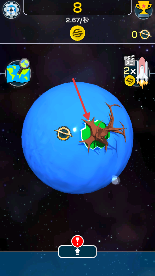 2、当下方出现带红色感叹号的按钮时,点击该按钮推进星球发展。