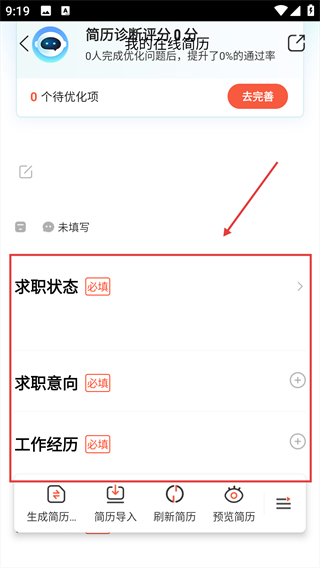 2、进入【我的简历】页面,填写【求职状态】【求职意向】【工作经历】等必填信息。