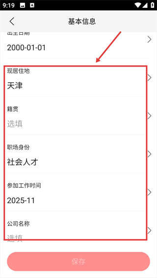3、填写【现居地】【籍贯】【职场身份】等信息,补充个人的基础资料内容。