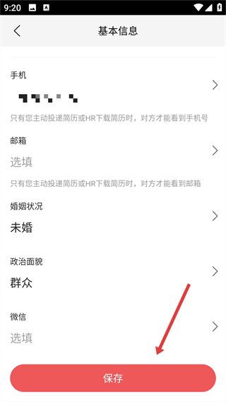 4、完成内容填写后,点击页面底部的【保存】按钮,保存个人简历。