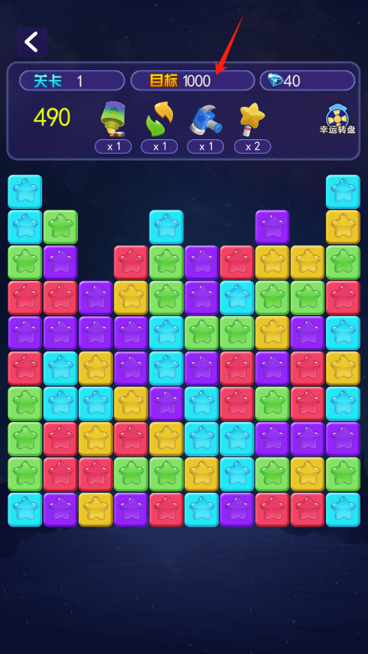 3、完成目标分数1000即可通关,但这里需消除全部可消除的剩余星星才会进入下一关卡。