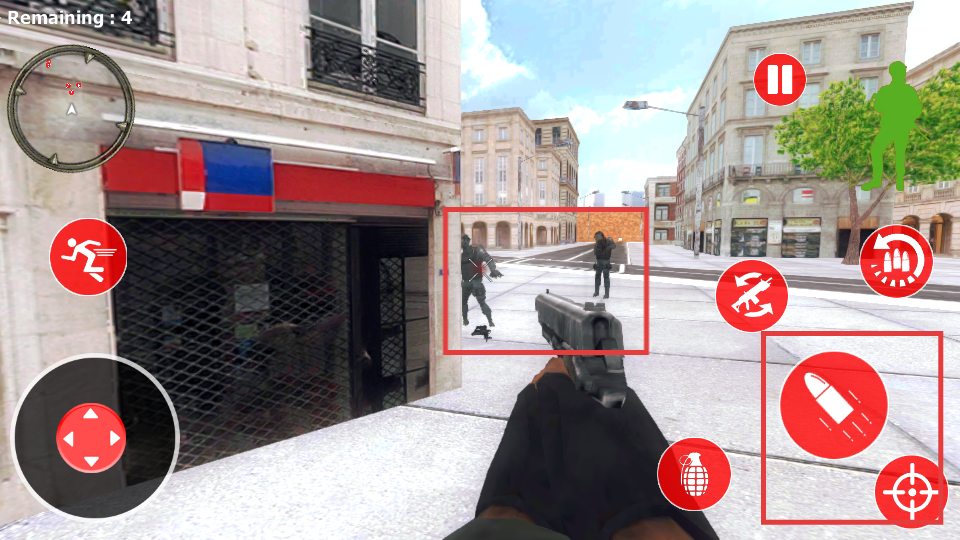 4、发现敌人后,瞄准目标,利用右侧射击等按钮,攻击敌人,减少剩余敌人数量,完成战斗任务。