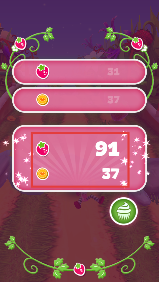 4、跑酷结束后,在结算界面查看收集到的草莓(如91个)和金币(如37个)等成果。