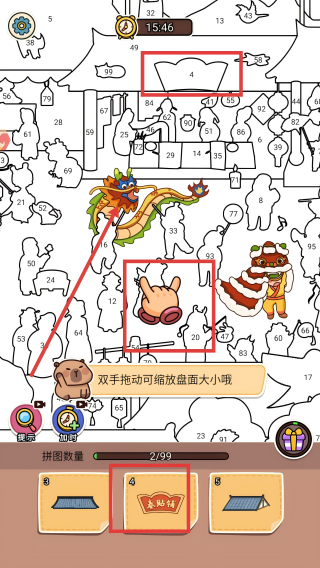 3、若拼图盘面大小不合适,可双手拖动来缩放,同时继续选取合适碎片,如【来财铺】,放置到对应位置。