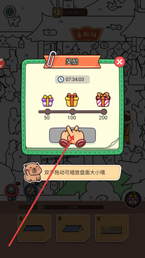 4、完成拼图后,会弹出奖励界面,可查看获得的奖励,还能了解不同进度对应的奖励情况。
