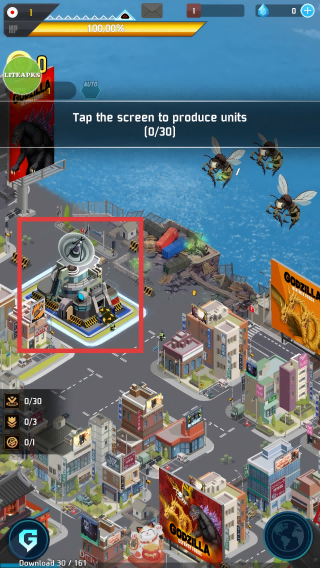 2、进入关卡,依据提示【Tap-the-screen-to-produce-units-(0/30)】,连续点击红框内的建筑,生产防御单位。