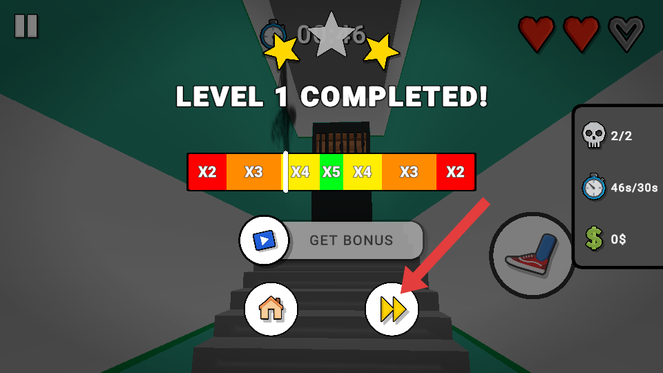 4、完成关卡后,出现【LEVEL-1-COMPLETED!】提示,点击箭头所指按钮,进入下一关。