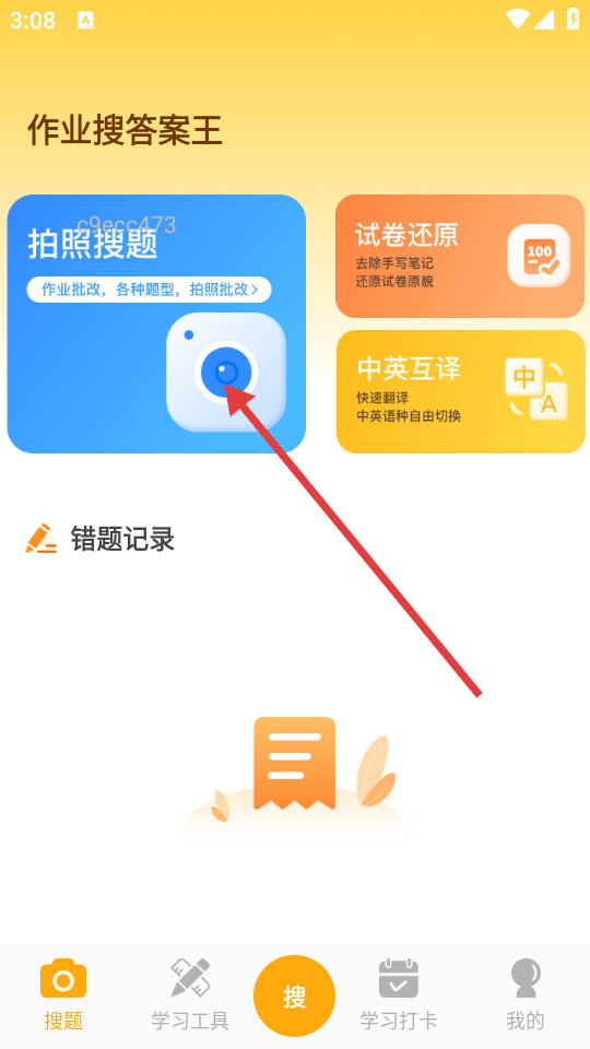 1、进入【作业搜答案王】主界面,点击【拍照搜题】区域,可进行作业批改等拍照搜题操作。