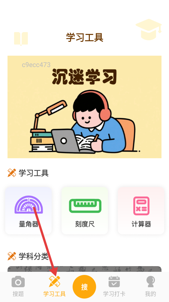 2、点击底部【学习工具】选项,进入学习工具页面,能使用量角器、刻度尺、计算器等工具。