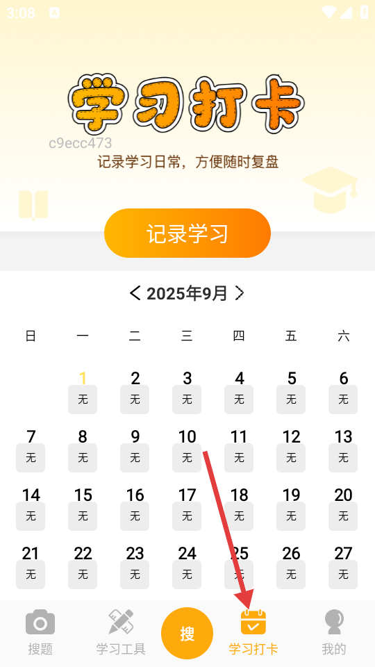 3、点击底部【学习打卡】选项,进入学习打卡页面,可通过【记录学习】按钮记录学习日常。