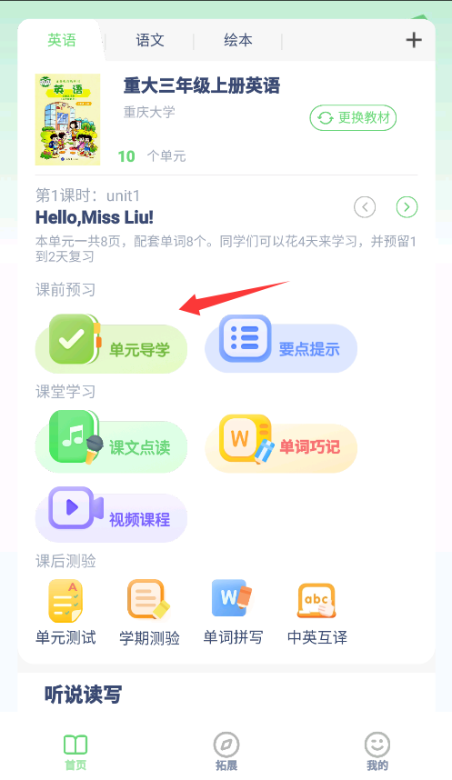 1、打开《重大英语点读》软件,在学科选择界面挑选英语、语文或绘本学科,并更换适配教材。