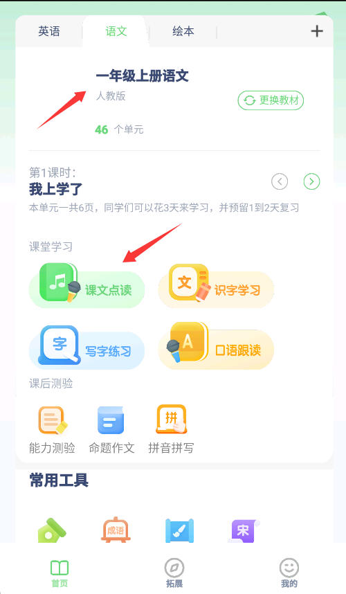 1、具备课文点读功能,英语与语文板块均支持点击课文文本发声,助力跟读学习,提升语言感知能力。