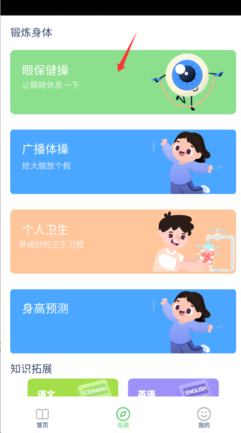 3、将学科学习与拓展内容结合,除学科核心学习模块外,还包含眼保健操等内容,兼顾学习与健康管理。