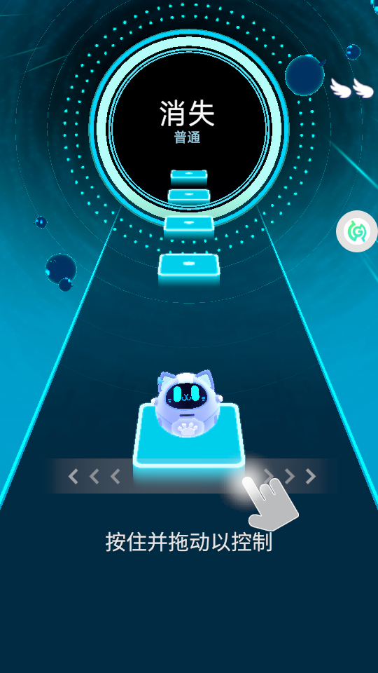 1、进入游戏,在“消失-普通”关卡,按“按住并拖动以控制”的提示,操控角色沿方块路径移动。