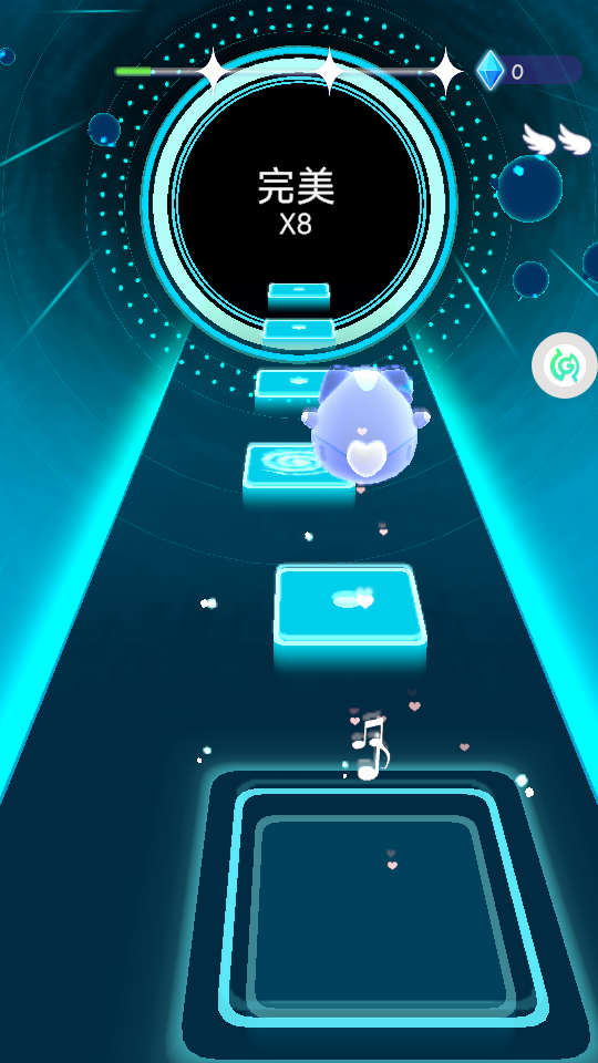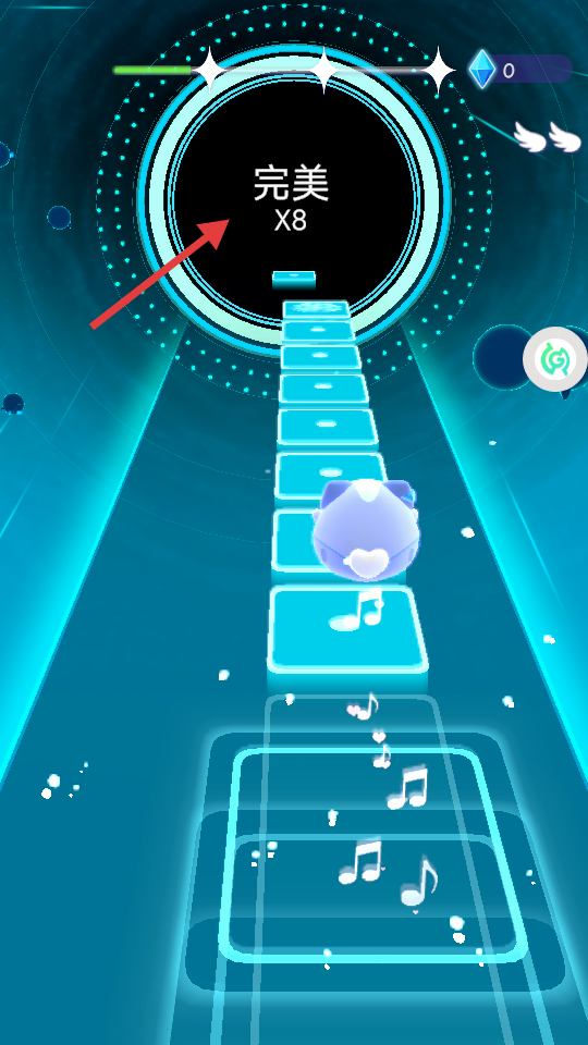 2、让角色精准踩中方块,获取“完美”评价,积累连续“完美”次数,同时收集音符等元素。