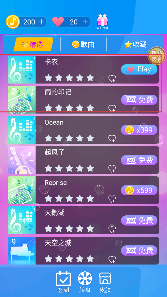 2、在歌曲选择界面,可挑选【卡农】【雨的印记】等歌曲,点击对应“Play”或“免费”按钮进入关卡。