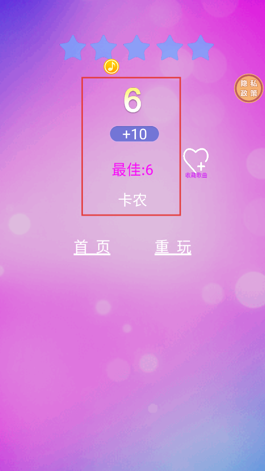 4、歌曲结束后,界面显示分数、最佳成绩等,可点击【首页】返回或【重玩】再次挑战该歌曲。