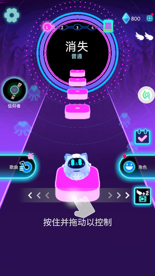 2、进入“消失-普通”关卡,按照“按住并拖动以控制”的提示,操控角色沿粉色方块路径移动。