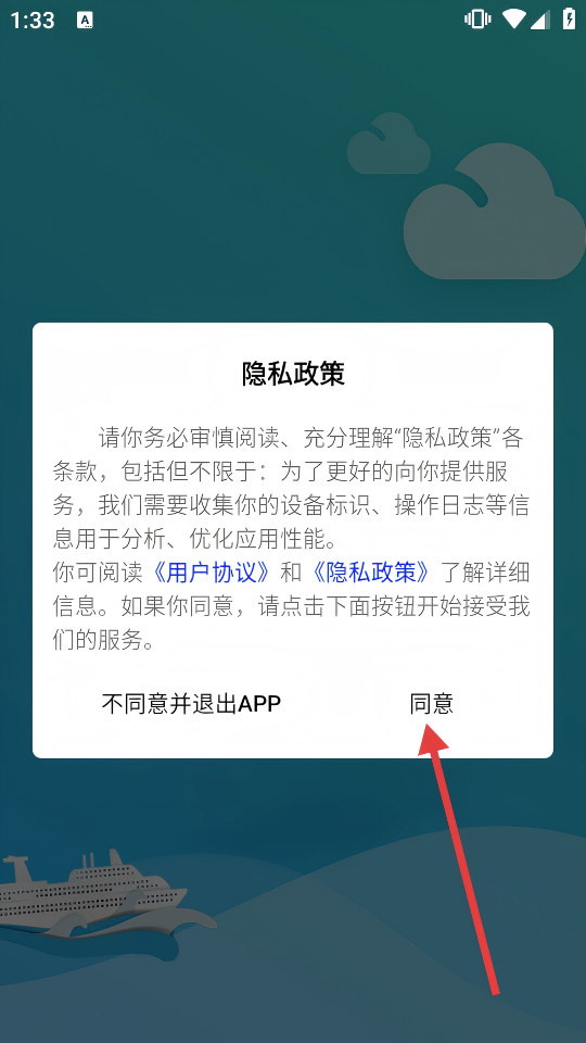 1、打开APP后,点击【同意】,同意隐私政策以继续使用服务。