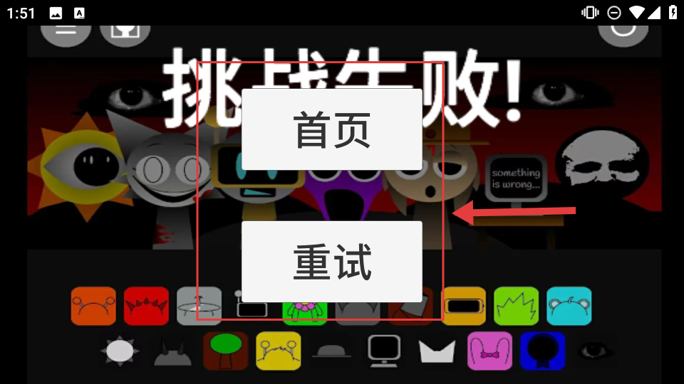 4、若挑战失败,可点击【重试】重新开始游玩,也可点击【首页】返回初始界面。