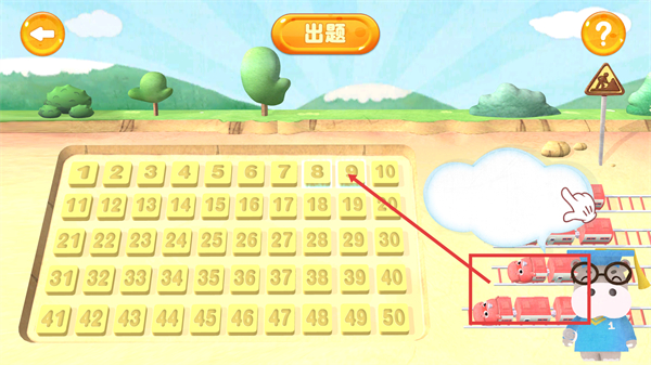3、题目呈现以1-50数字方格为核心,搭配手掌指针引导观察,界面元素简洁直观,符合低龄儿童认知与操作习惯。