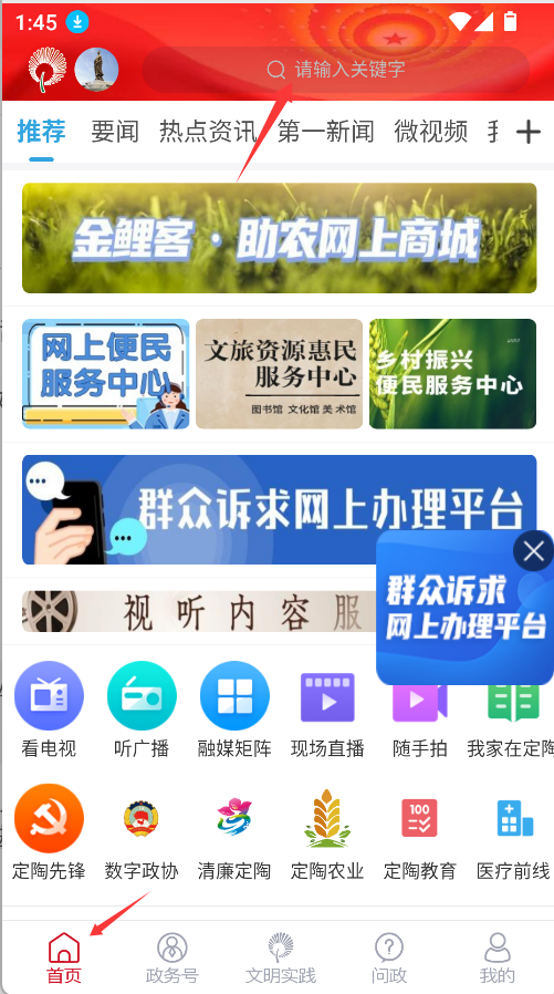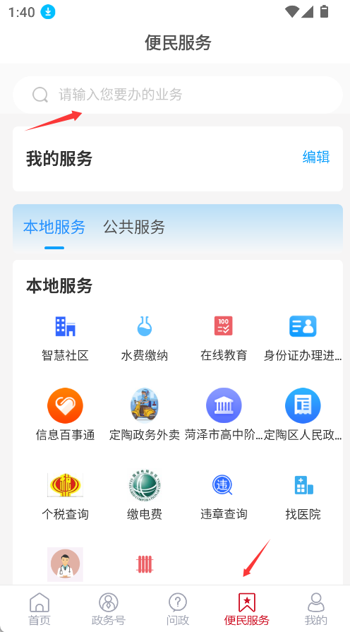 3、返回首页,点击“便民服务”搜索栏及下方多板块选项。