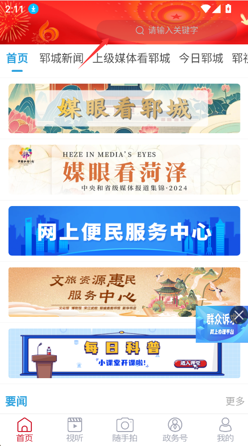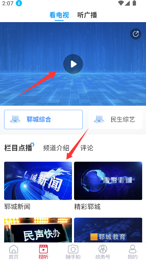 2、进入“视听”页面,点击播放按钮能看电视,也可选择“郓城新闻”等栏目点播。