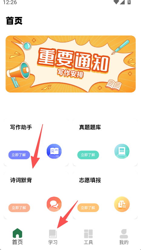 1、点击底部“学习”,选择“诗词默背”进入诗词内容页。