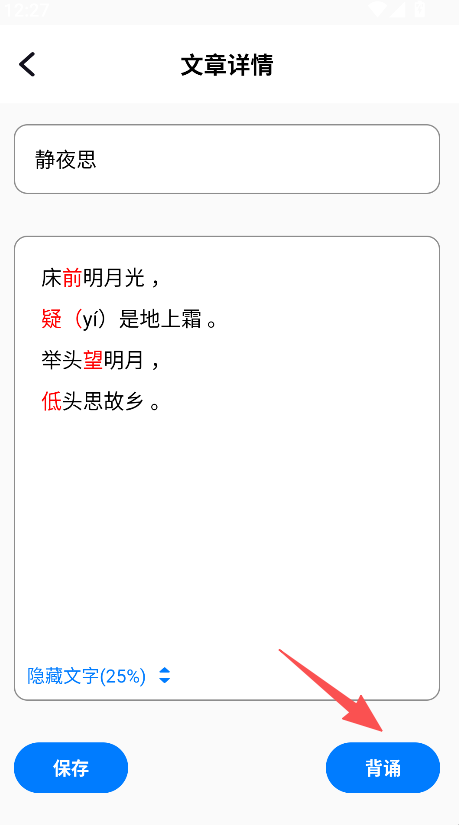 2、在诗词详情页,点击“背诵”进行诗词背诵练习。