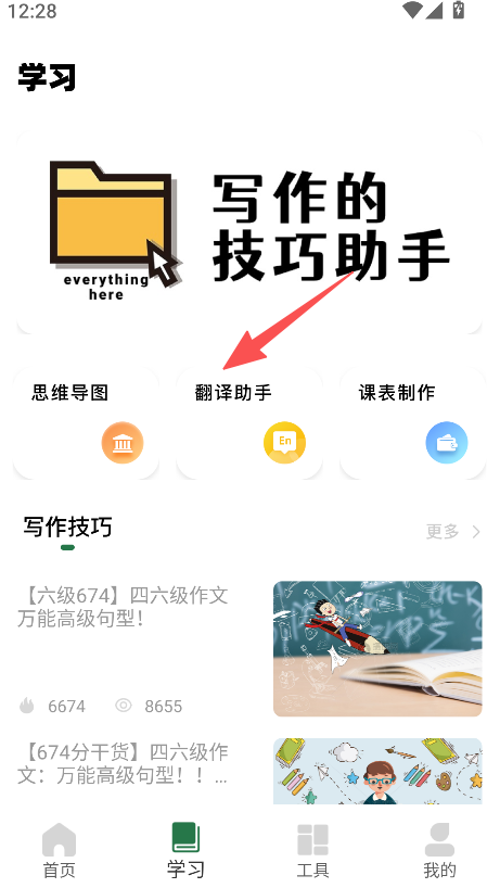 3、返回“学习”,点击“翻译助手”使用翻译辅助功能。