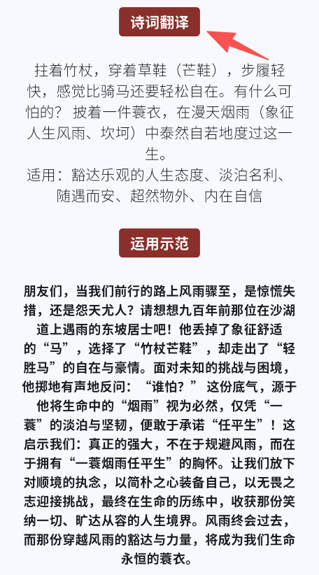 2、进入“诗词”分类,可查看诗词翻译、适用的人生态度及运用示范。