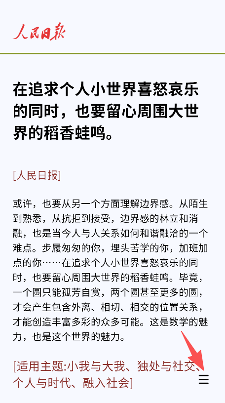3、进入“人民日报”分类,能查看语句、内涵解读及适用的写作主题。