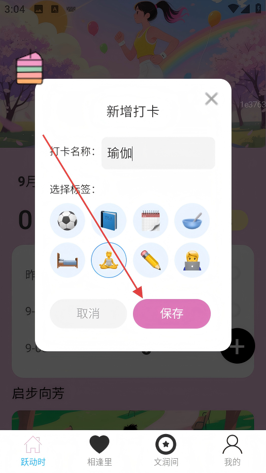 2、在“新增打卡”弹窗中,输入打卡名称“瑜伽”,选择对应标签,点击【保存】。