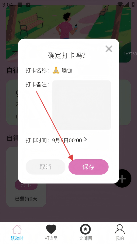 4、在弹窗中,可添加打卡备注、选择打卡时间,然后点击【保存】,完成瑜伽打卡。