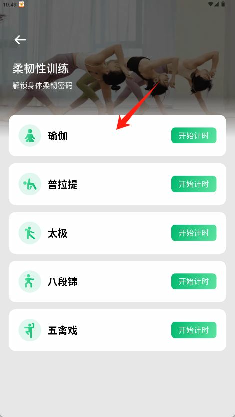 1、瑜伽训练项目入口,明确柔韧性训练内容选择位置。